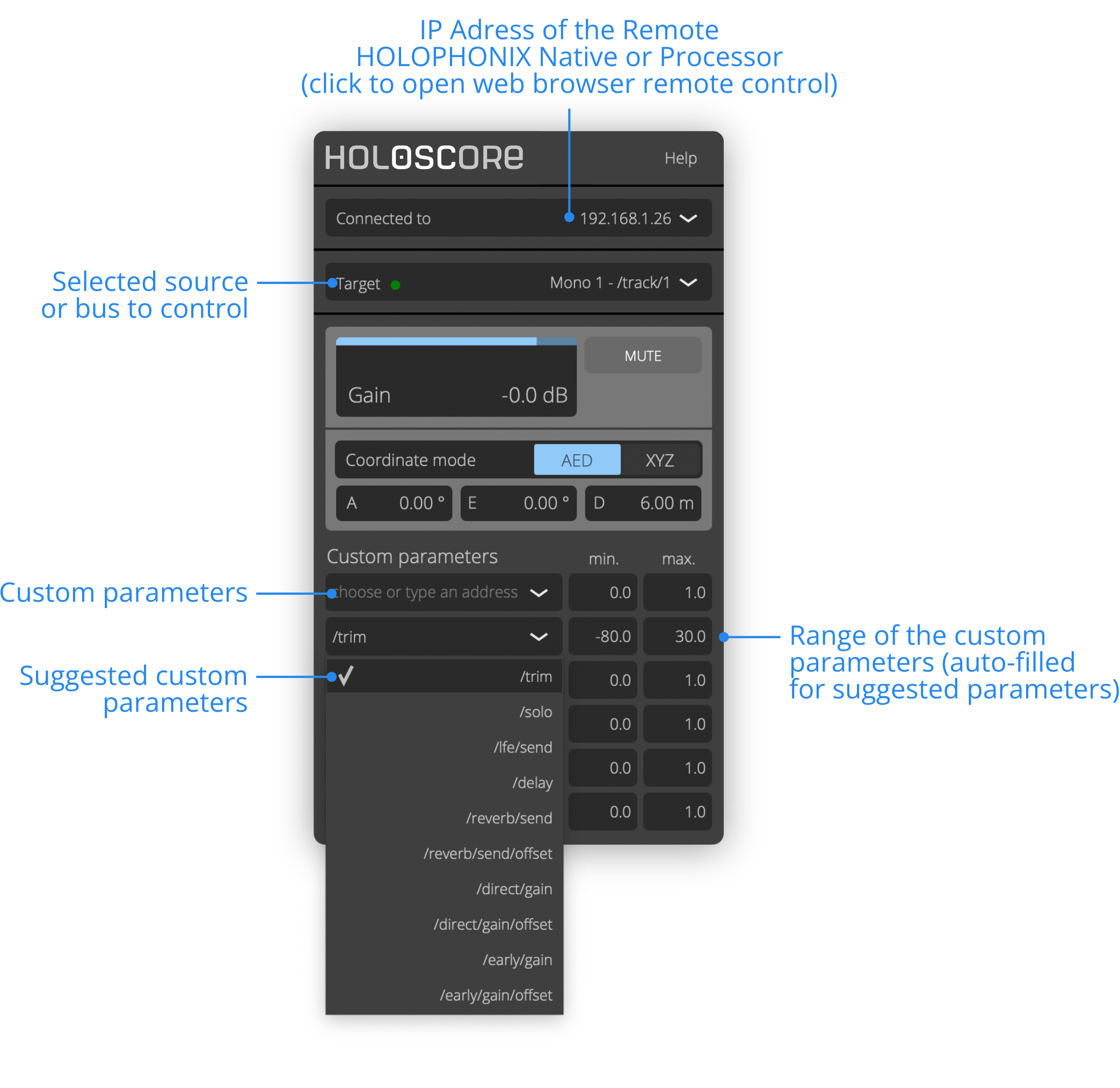 After inserting HOLOSCORE on a track of your DAW, the plugin will connect automatically to HOLOPHONIX. When the connection is successful, the indicator turns green, and the IP Address of your HOLOPHONIX hardware or software is displayed at the top of the plugin. If you click on the IP Address, you can open the Remote Control interface in a web browser.