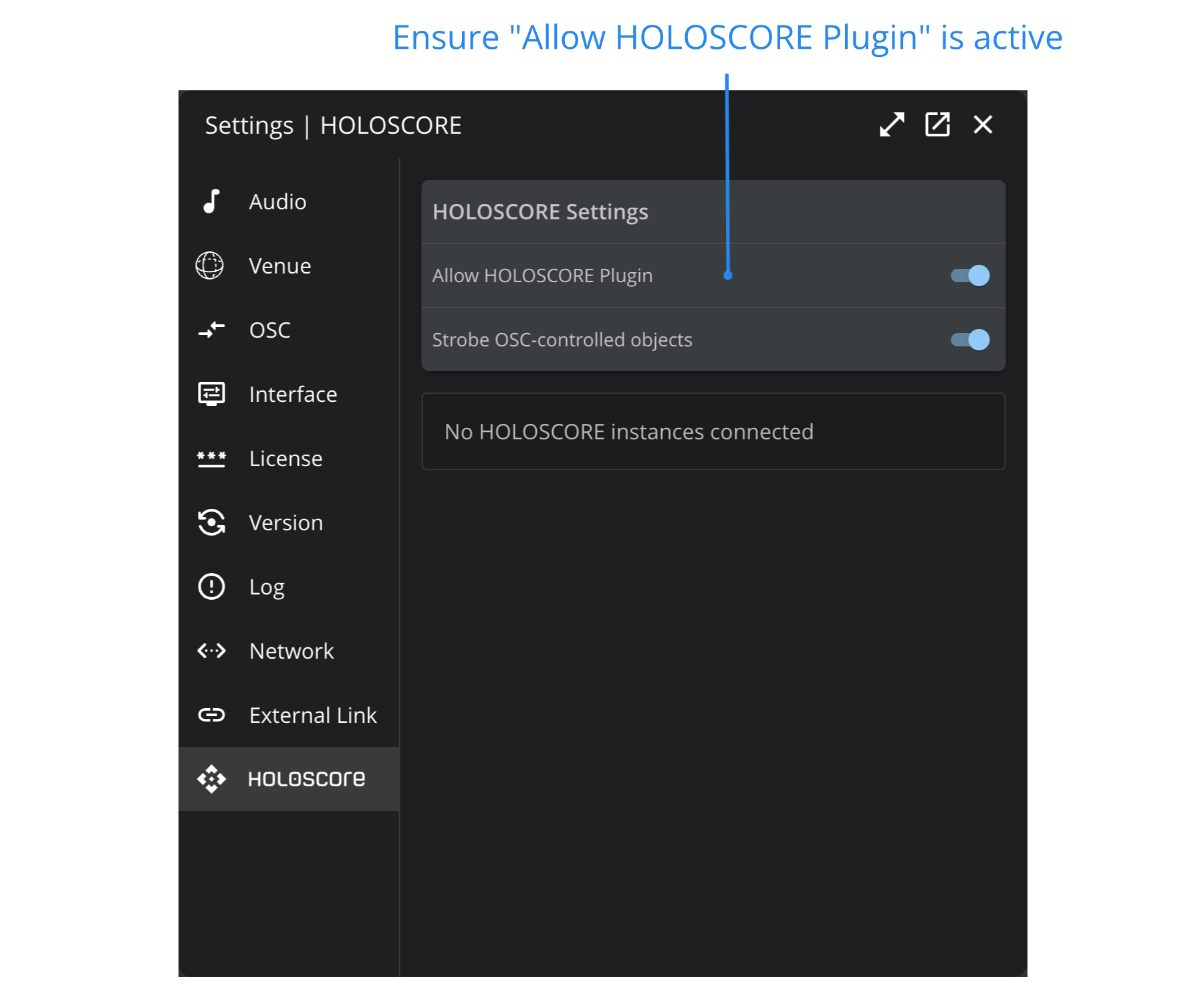 You can find the HOLOSCORE tab in the Settings window. Make sure that parameter "Allow HOLOSCORE Plugin" is activated in the Settings in HOLOPHONIX.