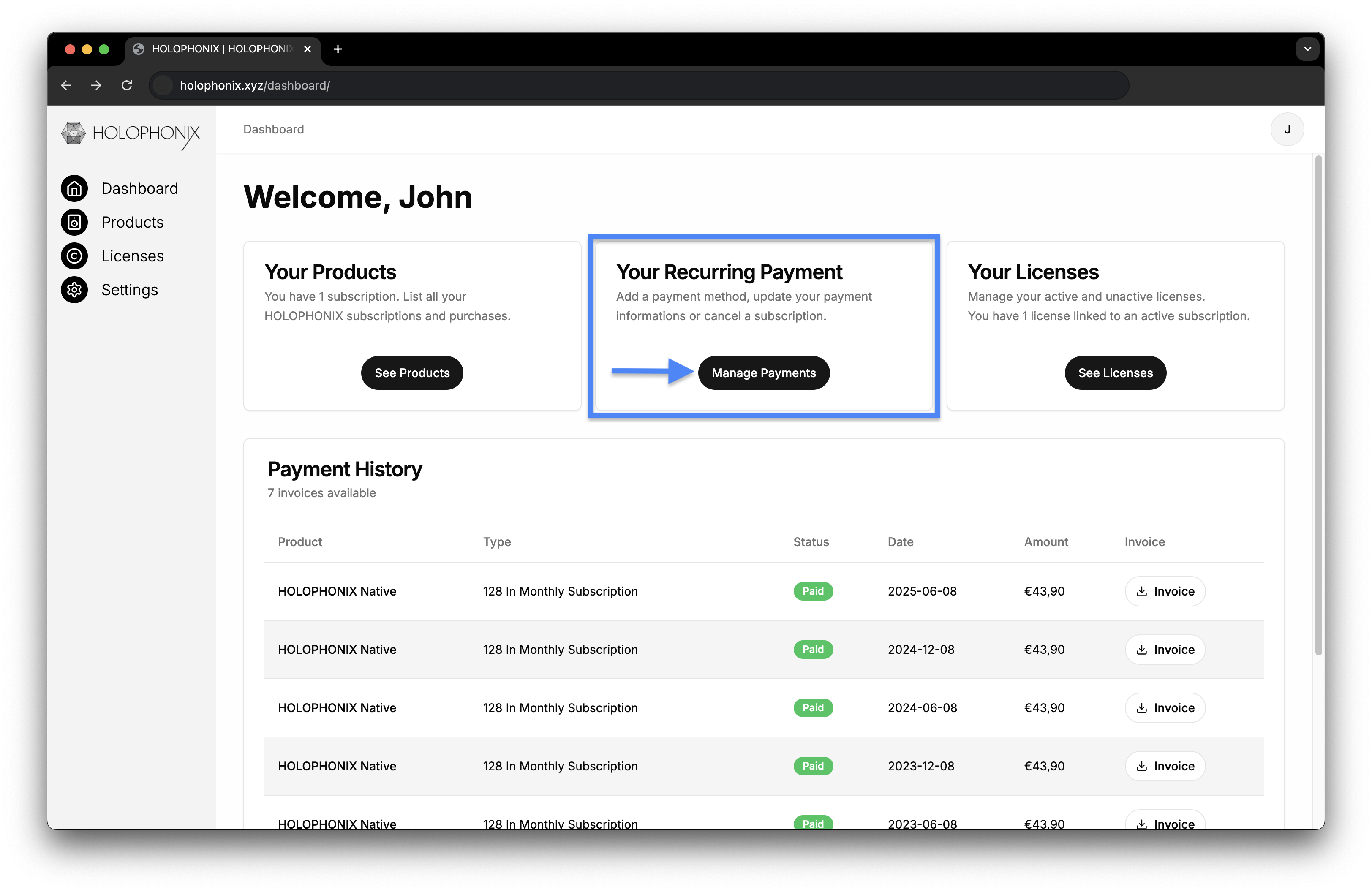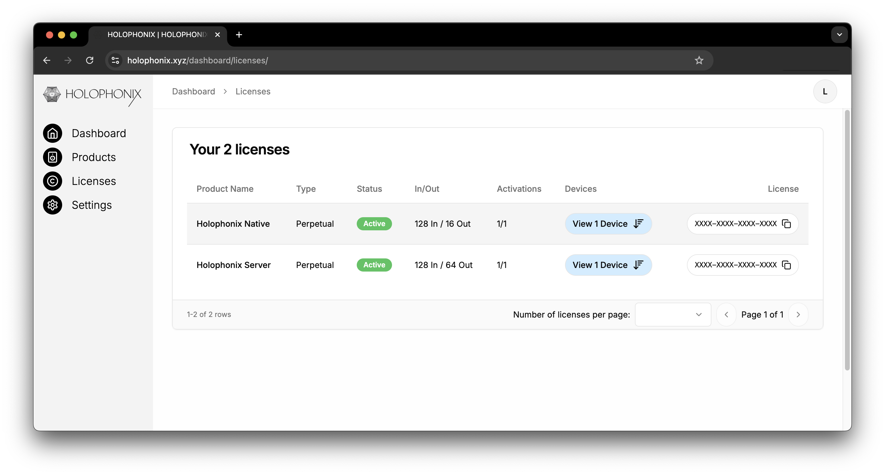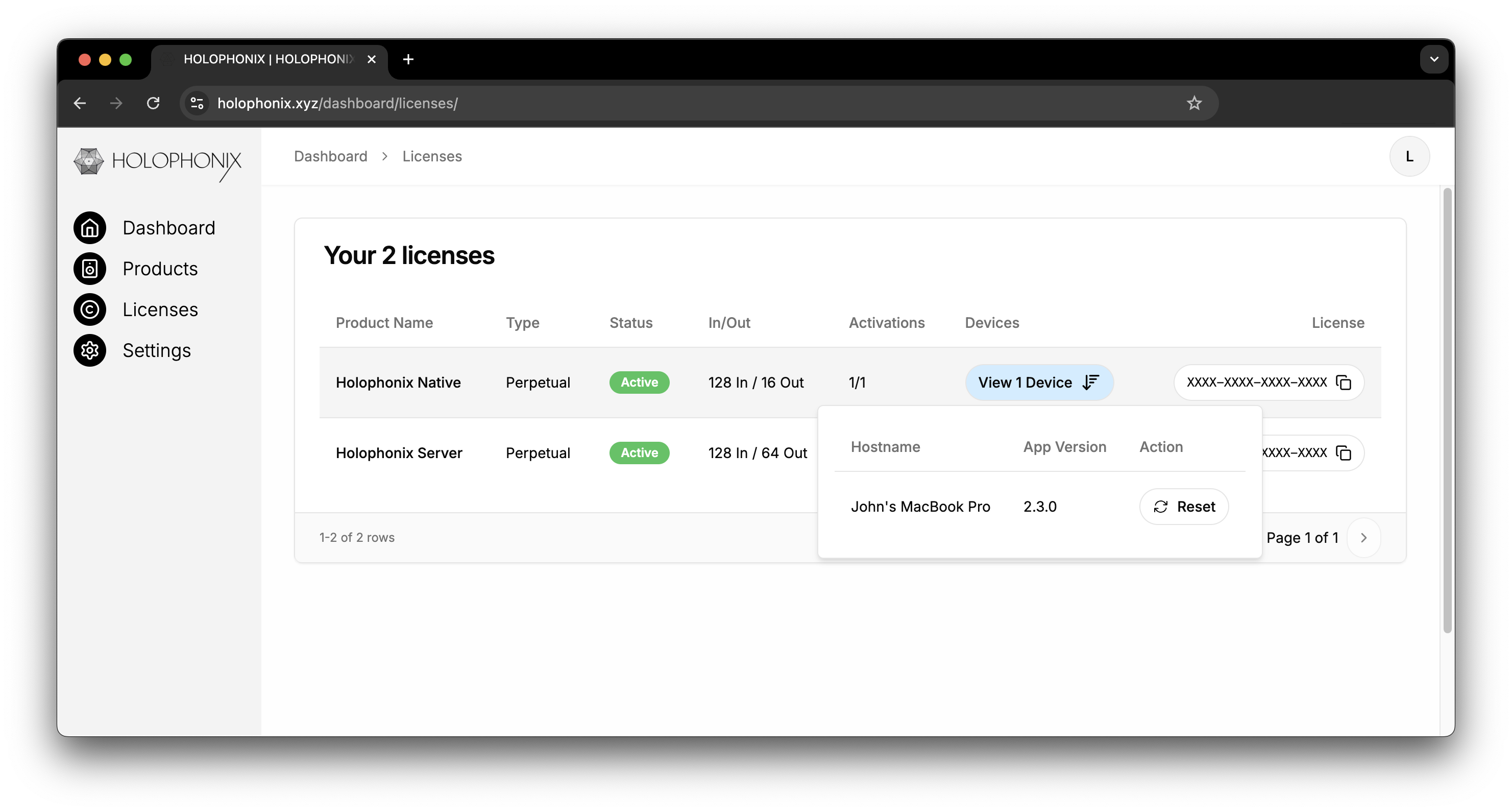 You can manage your HOLOPHONIX licenses in your dashboard in the Licenses tab on the HOLOPHONIX website. If you don't have an HOLOPHONIX account yet, you can create one by following this Link (be sure to use the same email address that you used while purchasing a license). This dashboard gives you complete control over your licenses and allows you to manage them efficiently.