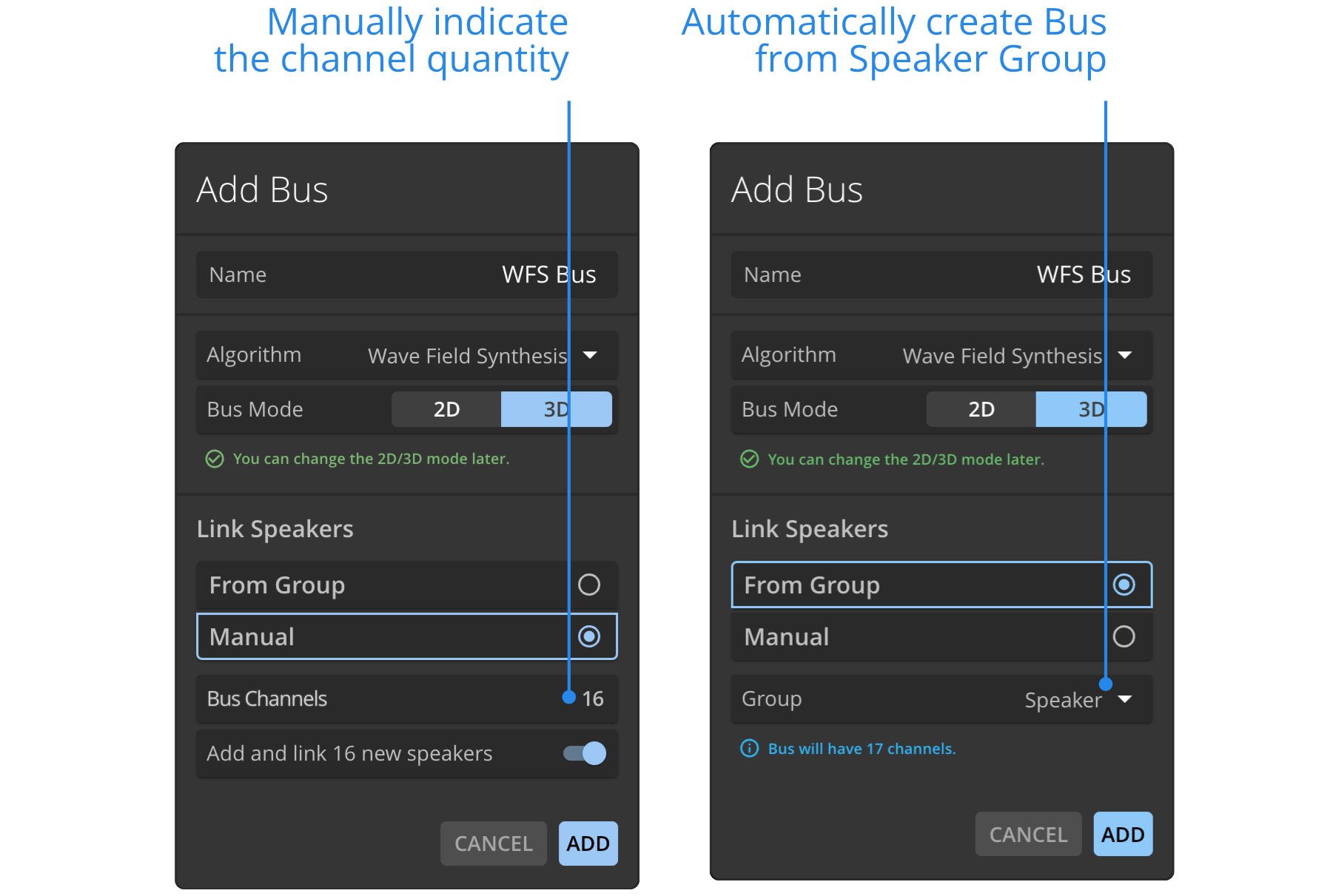 With Manual mode, enter the Number of Channels of your bus (corresponding to the number of loudspeakers that you will assign to the bus).