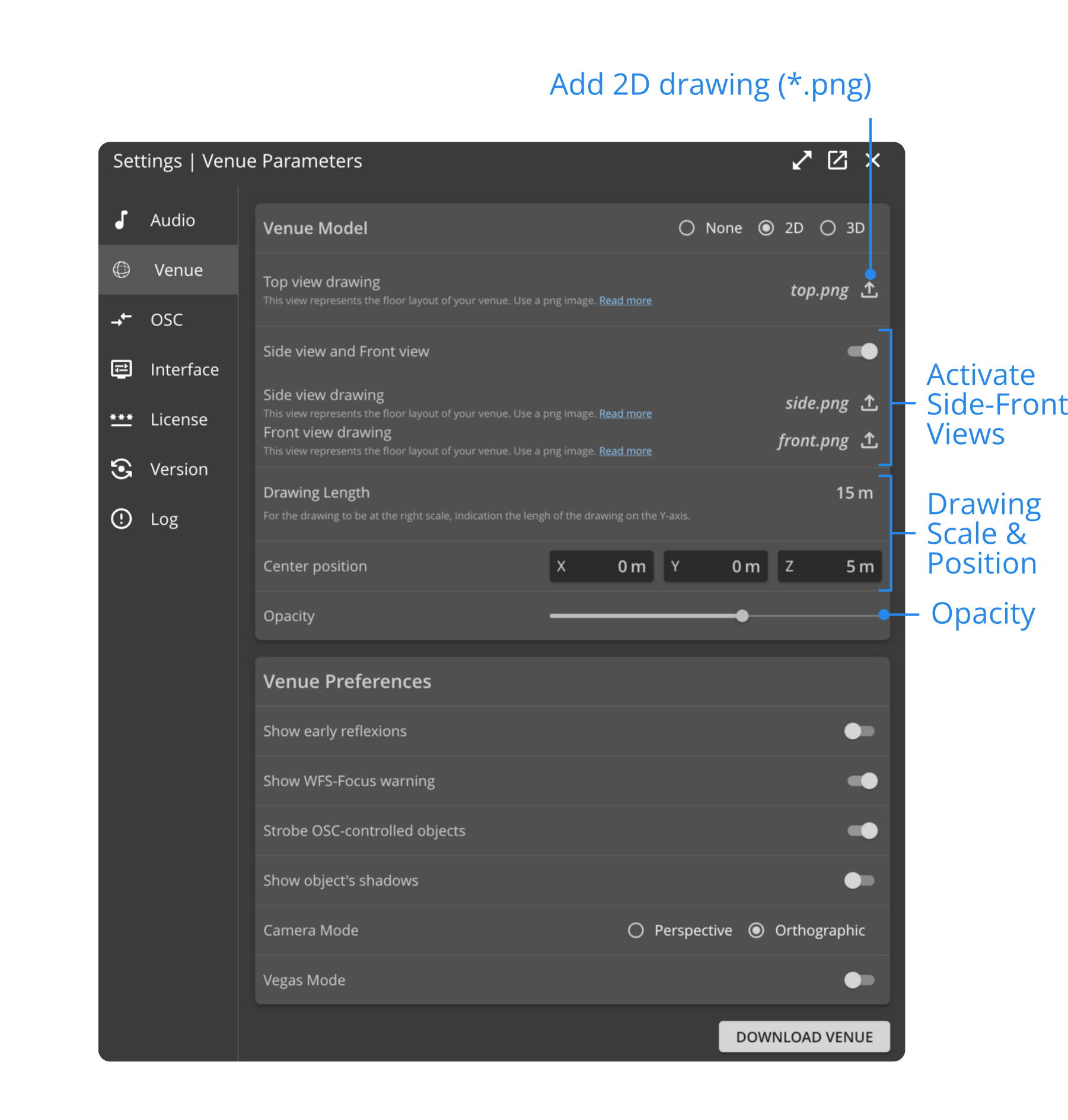 To import 3D Models or 2D Drawings, go to the "Venue Parameters" Menu, in "Settings | Venue Parameters". Then select "3D Model" or "2D Drawings" and import your file accordingly.