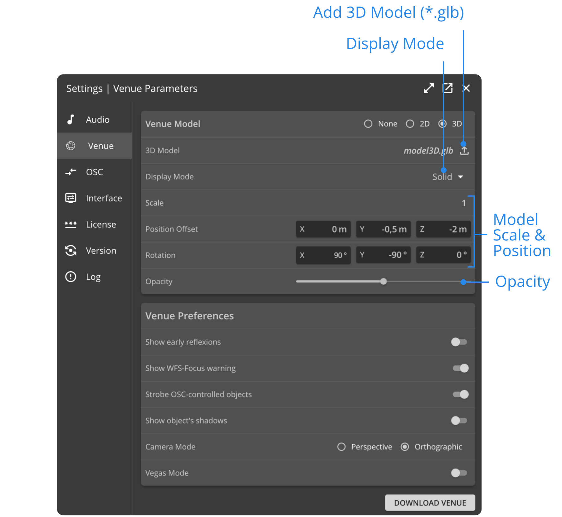 After importing the file, adjust its scale (if necessary), and use the Rotation and Position settings to align the 3D Model in the 3D Venue.