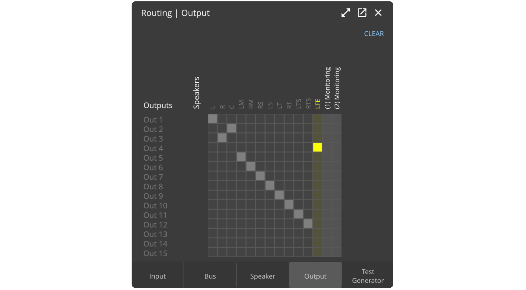 In the example below, the LFE of a 7.1.4 setup is routed to the 4th Output, which correspond to the Venue's subwoofer.