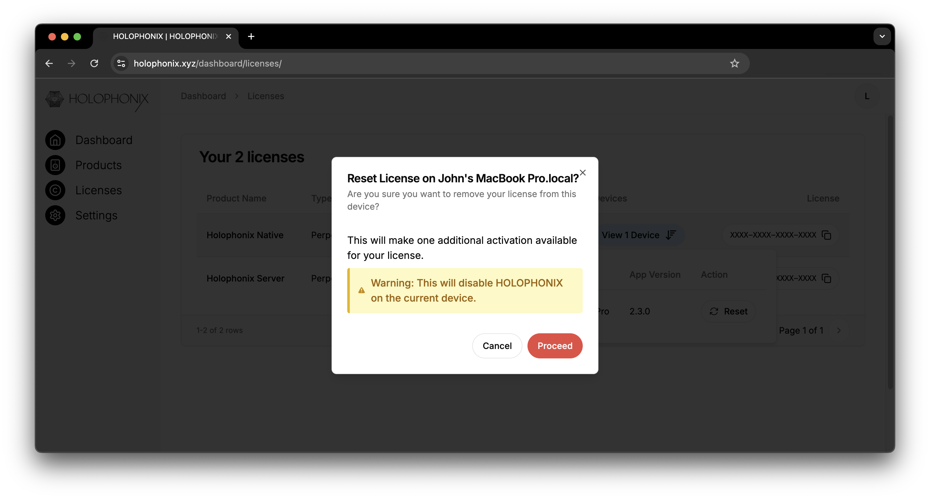 Si vous devez déplacer votre licence vers un ordinateur ou matériel différent, vous pouvez la réinitialiser directement depuis le tableau de bord en cliquant sur View Device puis Reset. Ce processus désactivera la licence sur l'appareil actuel, vous permettant de l'activer sur un nouvel appareil.