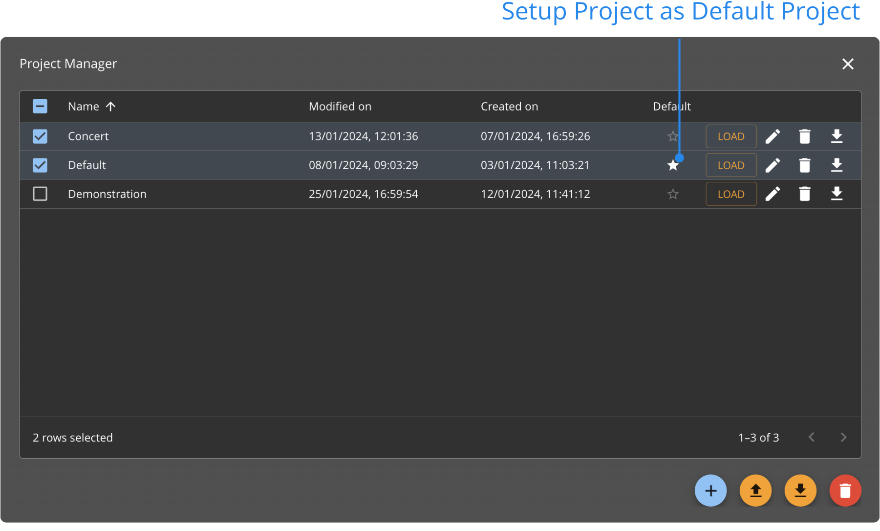 Vous pouvez définir un Projet par Défaut qui sera automatiquement chargé au démarrage. Cliquez sur l'icône "★" (étoile) pour choisir le projet par défaut.