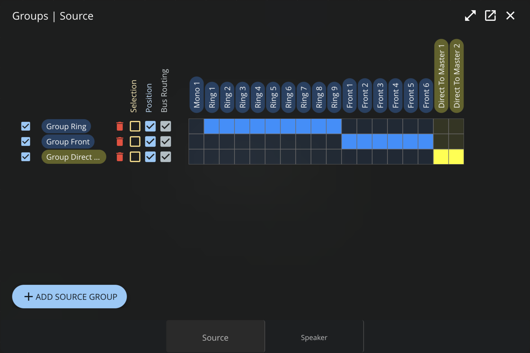 Routage BusLors du routage d'une Source vers un Bus, toutes les sources du groupe seront routées vers le même bus.