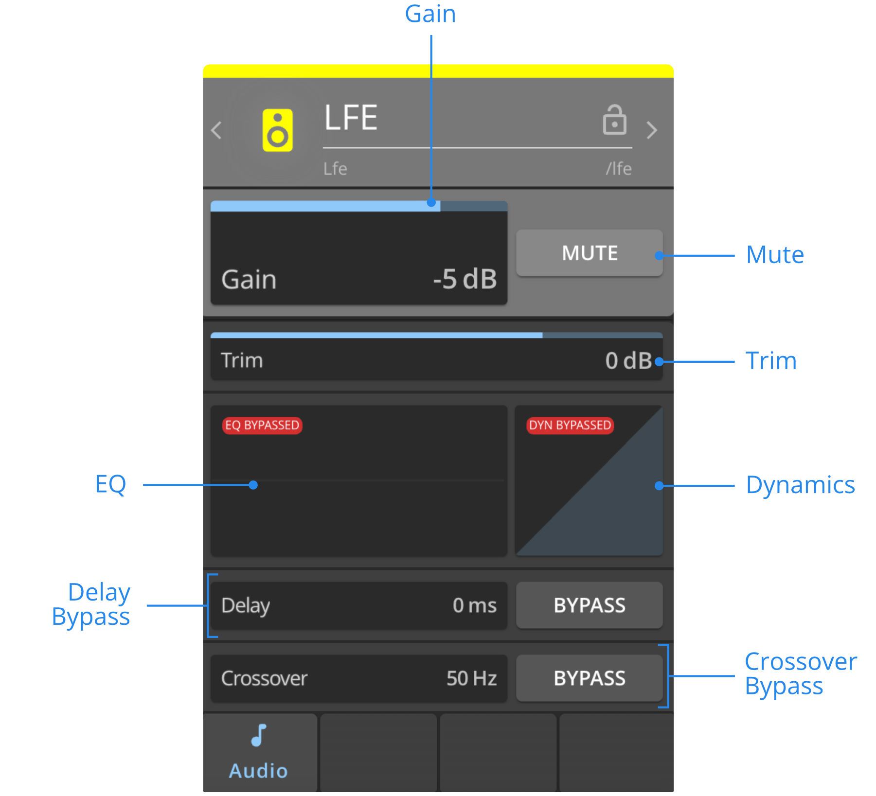 Utilisez le Delay pour aligner temporellement vos Subwoofers avec le système principal. Vous pouvez choisir de le Bypass.